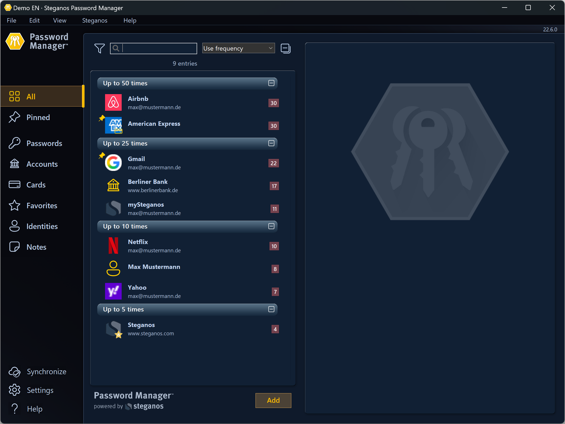 Steganos Password Manager uses strong AES 256-Bit encryption with PBKDF2 key derivation, providing for maximum security and making your keychains uncrackable.